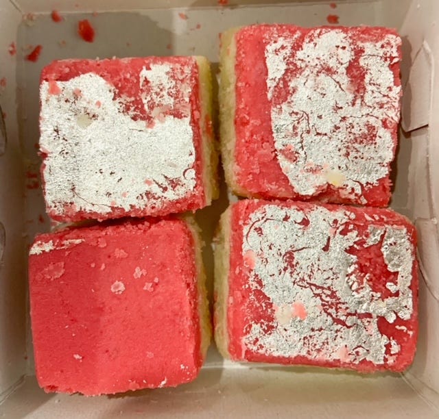 Besides these little post-meal rituals, I also grew up eating and drinking stuff that was very specific to the neighbourhood my ancestral home was in. My favourite sweet treat was the nariyal/coconut burfi from Bengali Sweet House, a sweet shop that was a five-minute walk from home. I was fascinated by the white and Barbie-pink cubes whenever I saw them, and began eating them because pink was my favourite colour growing up. One of those things that taste as good as they look, that burfi managed to carve a permanent spot within my heart. And so, one of the first boxes of goodies that I laid my hands on during my recent trip was, of course, filled with coconut burfi.